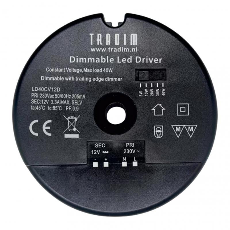 Tradim LD40CV12D LED Driver Ronde 12V AC/DC 1-40W 105x32mm Trou 10mm Gradable coupure de phase RC