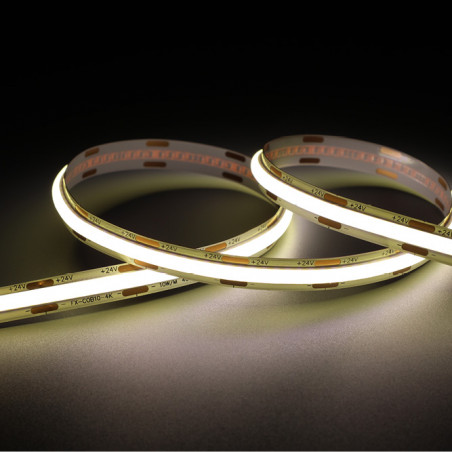 Ruban LED de la série PERFORMANCE. Le ruban se distingue par un effet déclairage uniforme grâce à lutilisation dun autre type de LED. Le ruban est composée de 384 LED COB par mètre avec une puissance de 9,6W/m et a une classe énergétique F. Convient aux envirronements intèrieurs et secs IP20. Rouleau de 5m. Le ruban de LED est contrlée par une tension de 24Vdc. Le ruban fournit 1000 Lm/m et a une température de couleur de 3000K avec un IRC de 90. Le ruban est dimmable via PWM.