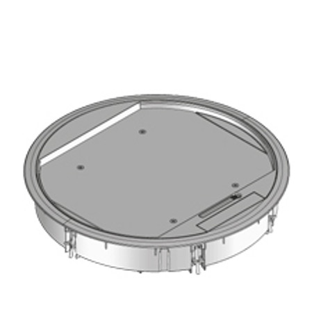 BOÎTE DE RACCORDEMENT RONDE AVEC REBORD EN POLYAMIDE NOIR, DIAMÈTRE 330 MM, PROFONDEUR DE POSE 10 MM POUR LE REVÊTEMENT DE SOL. AVEC LEVIER ET SORTIE DE CÂBLES AVEC BROSSE ET CONÇUE POUR P. EX. MAX. 12 PRISES DE COURANT 45X45. SET DE GRIFFES DE FIXATION I