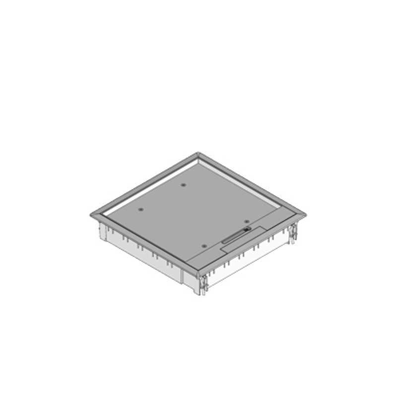 BOÎTE DE RACCORDEMENT CARRÉE AVEC REBORD EN POLYAMIDE GRIS, 280 MM X 280 MM, PROFONDEUR DE POSE 10 MM POUR LE REVÊTEMENT DE SOL. AVEC LEVIER ET SORTIE DE CÂBLES AVEC BROSSE ET CONÇUE POUR P. EX. MAX. 12 PRISES DE COURANT 45X45. SET DE GRIFFES DE FIXATION