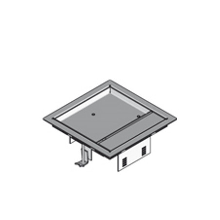 BOÎTE DE RACCORDEMENT CARRÉE AVEC REBORD EN ACIER INOXYDABLE, 187 MM X 187 MM, PROFONDEUR DE POSE 12 MM POUR LE REVÊTEMENT DE SOL. AVEC LEVIER ET SORTIE DE CÂBLES ET CONÇUE POUR P. EX. MAX. 2 PRISES DE COURANT 45X45. SET DE GRIFFES DE FIXATION INCLU.