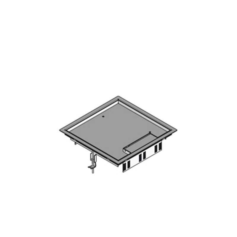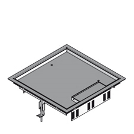 BOÎTE DE RACCORDEMENT CARRÉE AVEC REBORD EN ACIER INOXYDABLE, 284 MM X 284 MM, PROFONDEUR DE POSE 22 MM POUR LE REVÊTEMENT DE SOL. AVEC LEVIER ET SORTIE DE CÂBLES ET CONÇUE POUR P. EX. MAX.12 PRISES DE COURANT 45X45. SET DE GRIFFES DE FIXATION INCLU.