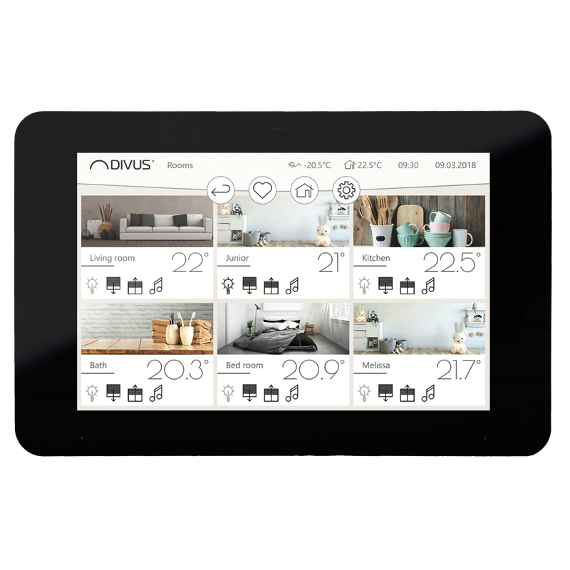 DIVUS KNX-IQ08-IP NOIR - ECRAN TACTILE MURAL DU BATIMENT A DES FINS DE VISUALISATION; ECRAN MULTITOUCH ET ECRAN TACTILE CAPACITIF AVEC LIAISON OPTIQUE DE 20,32 CM - 8'; RESOLUTION WXGA (1280X800); SYSTEME D'EXPLOITATION ANDROID AVEC VISUALISATION KNX DIVU