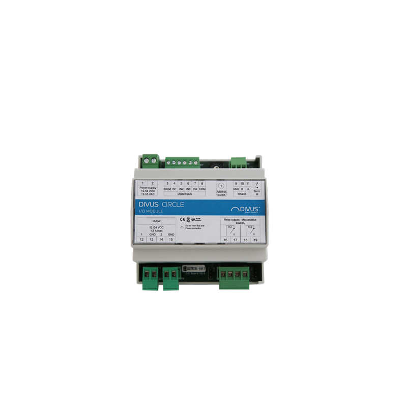 LE DIVUS MODULE I/O- 2 SORTIES RELAIS (APPLICATION: CONTROLE DES SERRURES ELECTRIQUES (CHARGE VARIABLE ENTRE 250 MA ET 1,5 A A 12-24 V), CONTROLE DE L'ECLAIRAGE (12 - 220 V))- 2 SORTIES NUMERIQUES (12-24VDC)- 4 ENTREES DIGITALES (LIBRES DE POTENTIEL)- EST