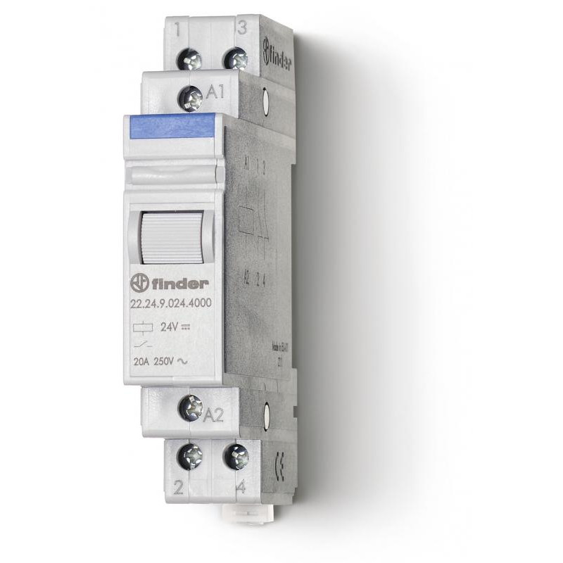 Description: Relais modulaire bipolaire 2NC 20A 230V AC, bouton poussoir de test, matériau des contacts AgSnO2