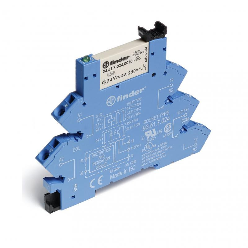 Description: Interface modulaire à relais électromécanique, 1RT 6A 48V DC version sensible, étrier plastique de maintien, largeur 6,2mm, matériau des contacts AgNi + Au, bornes à ressort