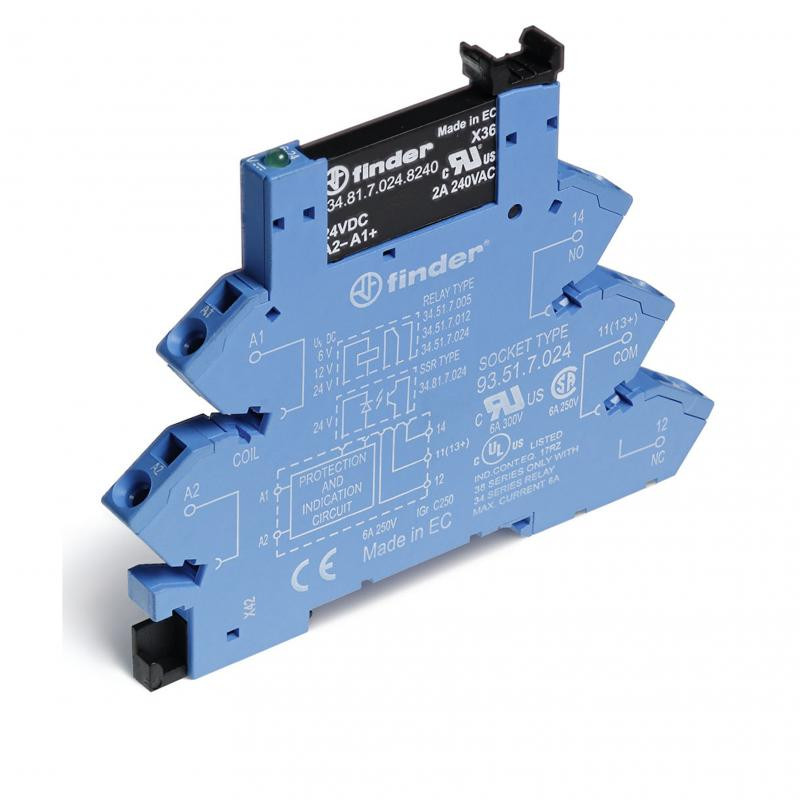 Description: Interface modulaire à relais statique 1NO 2A, entrée : 24V DC version sensible, sortie: 240V AC, étrier plastique de maintien, largeur 6,2mm, bornes à ressort