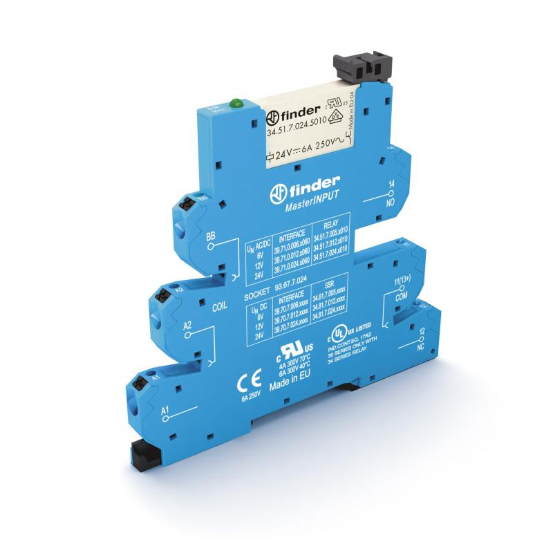 Description: Interface modulaire à relais électromécanique masterINPUT 1RT 6A 24V AC/DC, matériau des contacts AgNi + Au, étrier plastique de maintien, bornes automatiques