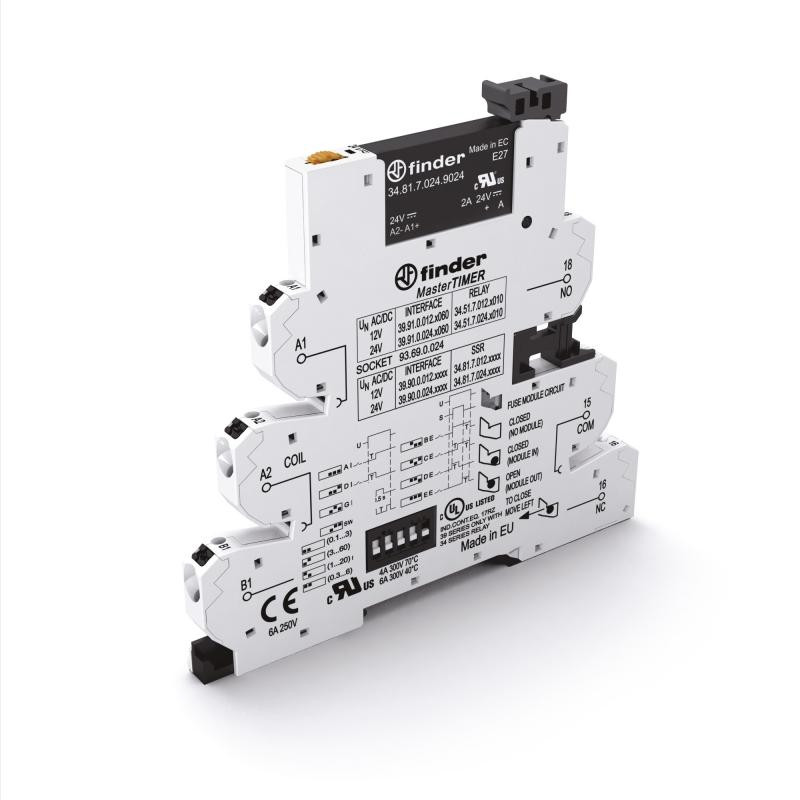 Description: Interface modulaire à relais statique masterTIMER 1NO 6A entrée : 24V AC/DC, Sortie : 24V DC, 4 plages de temporisation, 8 fonctions, étrier plastique de maintien, largeur 6,2mm, option porte-fusible, bornes automatiques