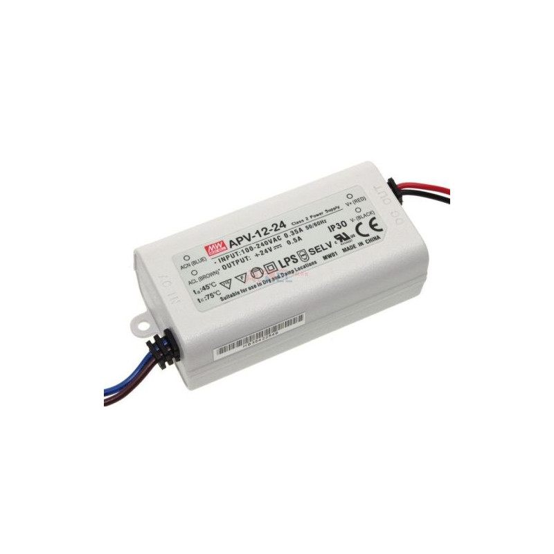 Alimentation led en boitier plastique IP30 classe 2. Primaire 90-264VAC secondaire 24VDC 12W.Protégé contre courts-circuits, surcharges et envergure.