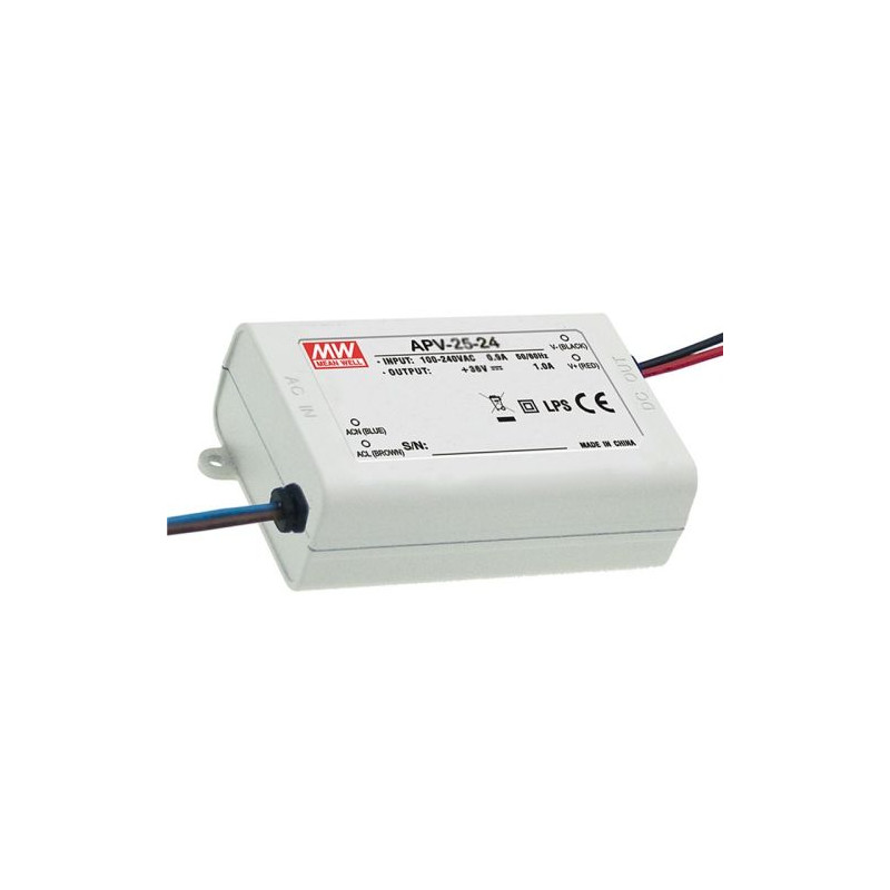 Alimentation led en boitier plastique IP30 classe 2. Primaire 90-264VAC secondaire 24VDC 25W.Protégé contre courts-circuits, surcharges et envergure.