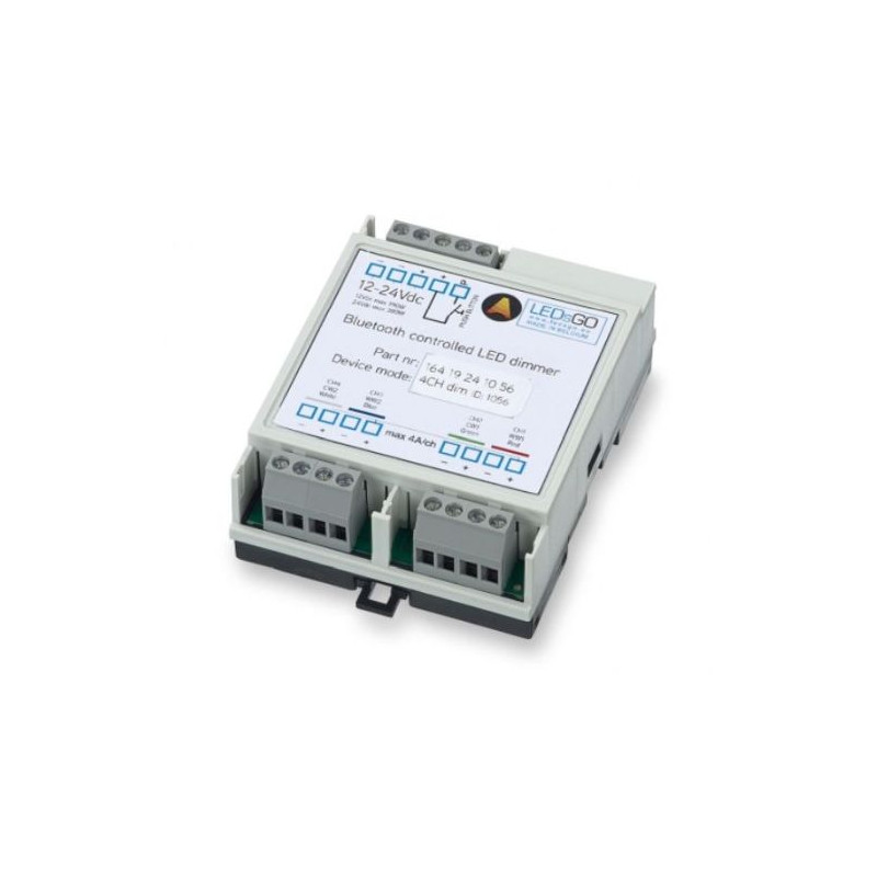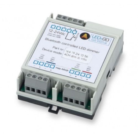 Integraconnect interface Bluetooth low energy IP20 avec 4 canaux et adapteur DIN rail pour rubans led mono-couleur. 4 canaux contrlables séparément de 4A, maximum 96W par canal à 24VDC. Un bouton-poussoir peut être connecté directement à linterface pour allumer/éteindre et atténuer. Convient pour 12/24VDC. Integraconnect est 100 compatible avec Casambi. Téléchargez lapplication gratuite sur Apple Store ou Google Play.
