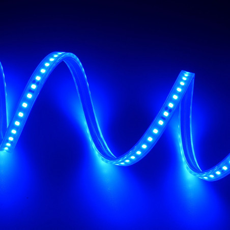 Ruban LED monocolore bleu de la série ADVANCED. Le ruban est composée de 140 LED SMD bleu par mètre. Le ruban a une puissance de 6,3W/m et une classe énergétique G. Convient aux environnements extèrieurs et humides IP67. Rouleau de 5m. Le ruban de LED est contrlée par une tension de 24Vdc. Le ruban fournit 115 Lm/m et a une température de couleur de K avec un IRC de . Le ruban est dimmable via PWM.