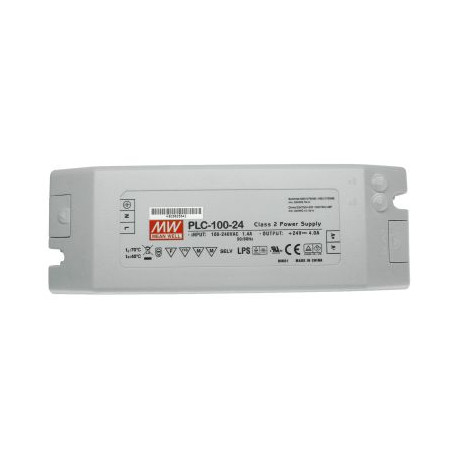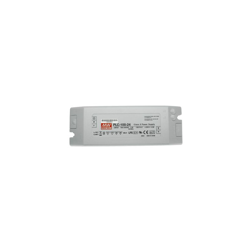 Alimentation LED en boîtier plastique IP20 classe 2. Primaire 230Vac, secondaire 24Vdc 100W. Protégé contre courts-circuits, surcharges et surtension.