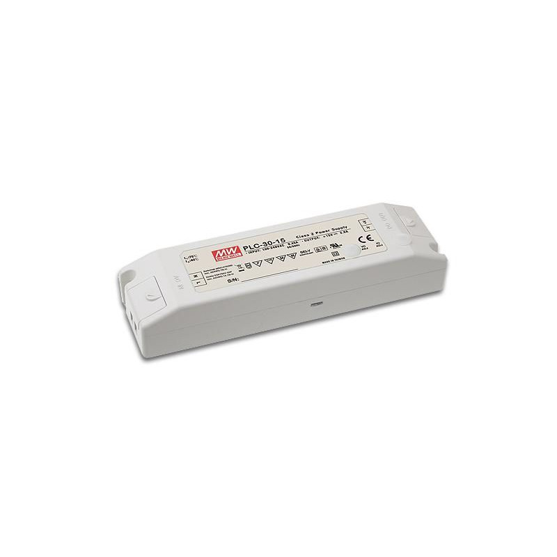 Alimentation LED en boîtier plastique IP20 classe 2. Primaire 230Vac, secondaire 24Vdc 30W. Protégé contre courts-circuits, surcharges et surtension.