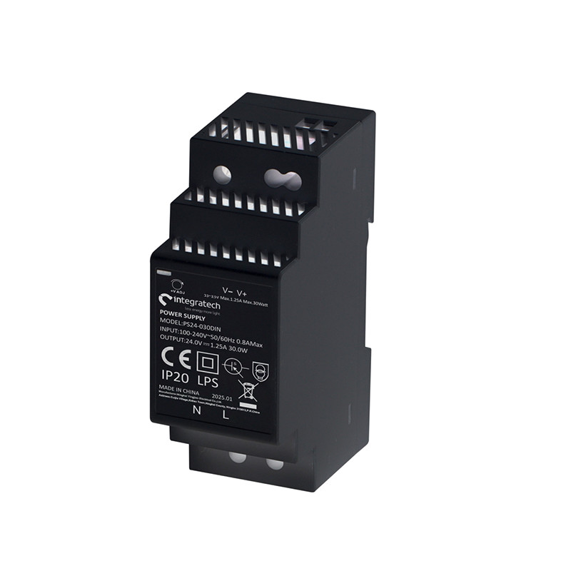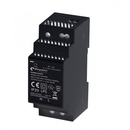 Alimentation ruban LED Constant Voltage, classe 2 en boîtier plastique. Primaire 100-240VAC, secondaire 24VDC 30W. Boïtier Din-Rail 2 moduless largeur module IP20, dimmable par contrle externe. Protégé contre courts-circuits, surcharges et surtension.