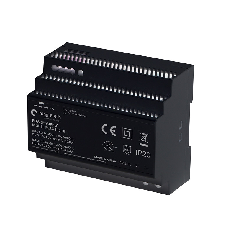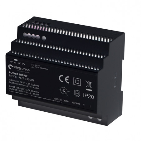 Alimentation ruban LED Constant Voltage, classe 2 en boîtier plastique. Primaire 200-240VAC, secondaire 24VDC 150W. Boïtier Din-Rail 6 modules largeur module IP20, dimmable par contrle externe. Protégé contre courts-circuits, surcharges et surtension.