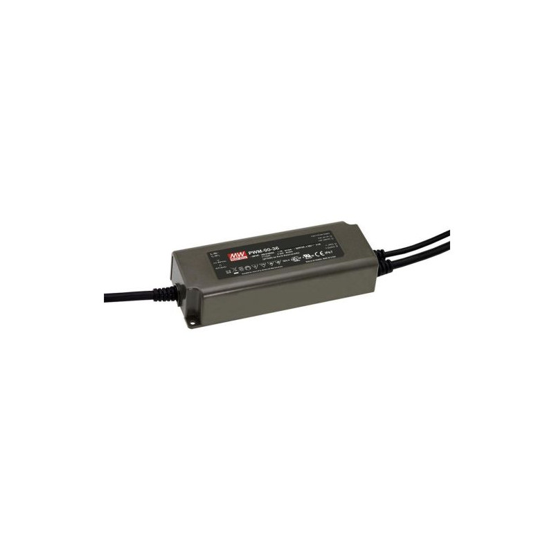 Alimentation basse puissance de classe II dans un boîtier en plastique IP67 90264VCA/24VDC. 90W Avec fonction de gradation intégrée 1-10V/PWM. Protection contre les courts-circuits, les surcharges et les surtensions.