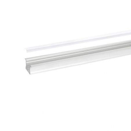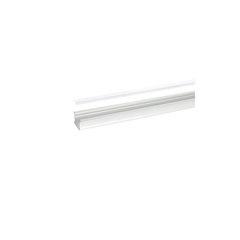 Profile led encastré RSL15 en aluminium anodisé AL6063 en finition blanche RAL9016. Kit complet avec profile led de 2m, couvercle opale en PC, 2 embouts sans entrée de câble, 2 embouts avec entrée de câble dans un tube en carton robuste et résistant.