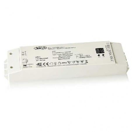 Controleur DALI pour bandeaux led mono-color, bi-color, rgb ou rgbw. Max 5A par canal, max. 480W sur 24VDC. Avec display pour affichage adresse DMX. Adresse DALI ajustable manuellement ou automatiquement.
