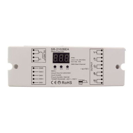 Controleur DMX pour bandeaux led mono-color, bi-color, rgb ou rgbw. Max 8A par canal, max. 760W sur 24VDC. Avec display pour affichage adresse DMX.