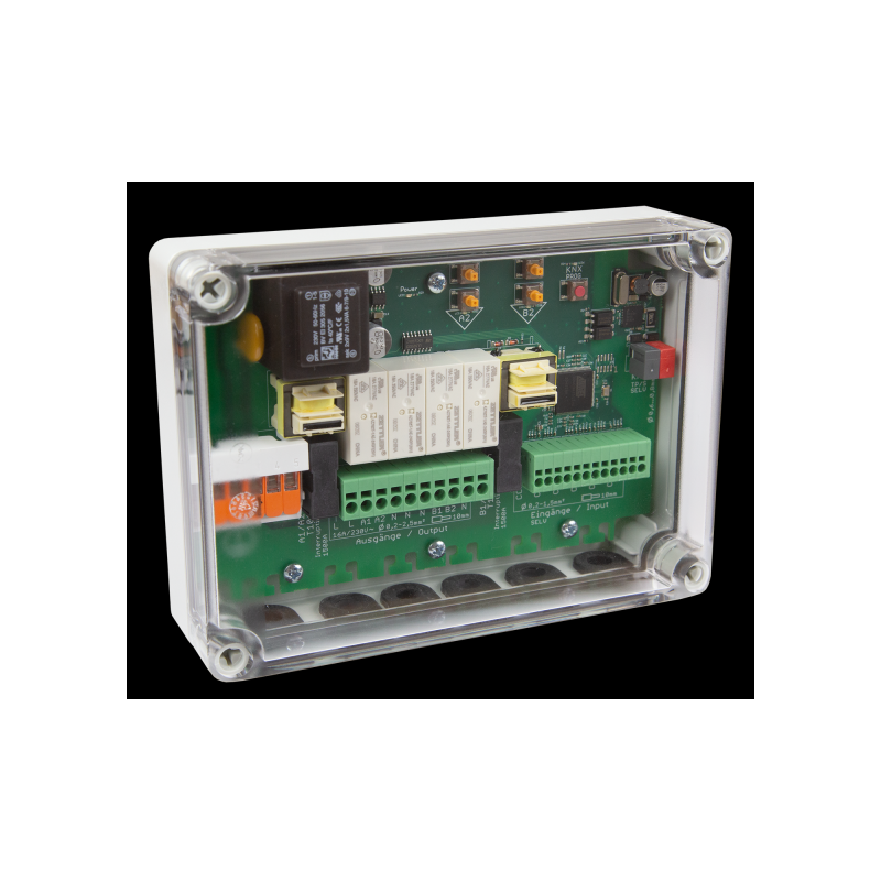 Description: 2 sorties (6A - 230VDC)6 entrées numériques (6...80Vdc - 6...240Vac)Durée de fonctionnement du moteur automatiquement (mesure active du courant) ou via ETSFonctions de blocage et de sécurité (vent, pluie...)Commande de façade en fonction de la position du soleil (également pour l'angle des lamelles)16 scénarios par sortieCommandes disponibles en entrées:On, Off, toggle, commande variateur et commande de jalousie, scénario, fonction sonnette de porte, envoi de valeursTension auxiliaire 230Vac nécéssairePour