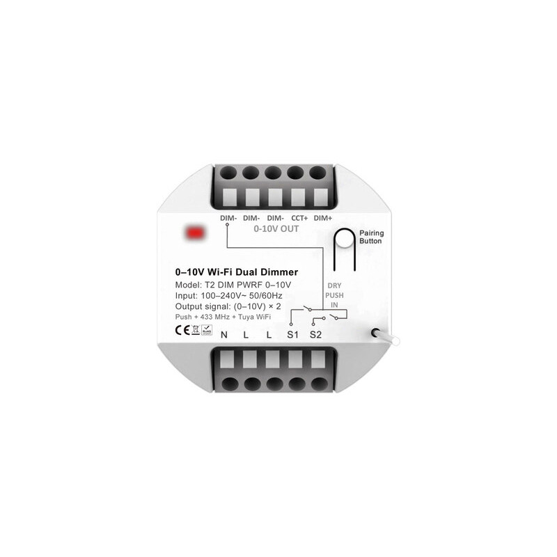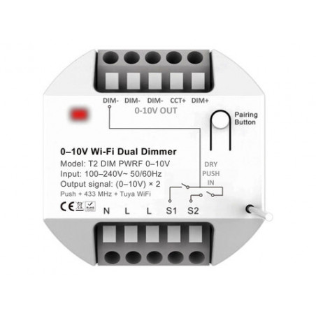 Description: DIMMER TRIAC 2 CANAUX RF+WIFI (TUYA) ET/OU BOUTON POUSSOIR 2X 0-10V