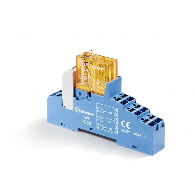 Marque: FINDER Référence: 48P570120050SMA Description: Interface modulaire à relais, 2RT 8A 12V DC version sensible, étrier métallique, bornes Push-in, module de présence tension et protection bobine, LED + diode Emballage: 10