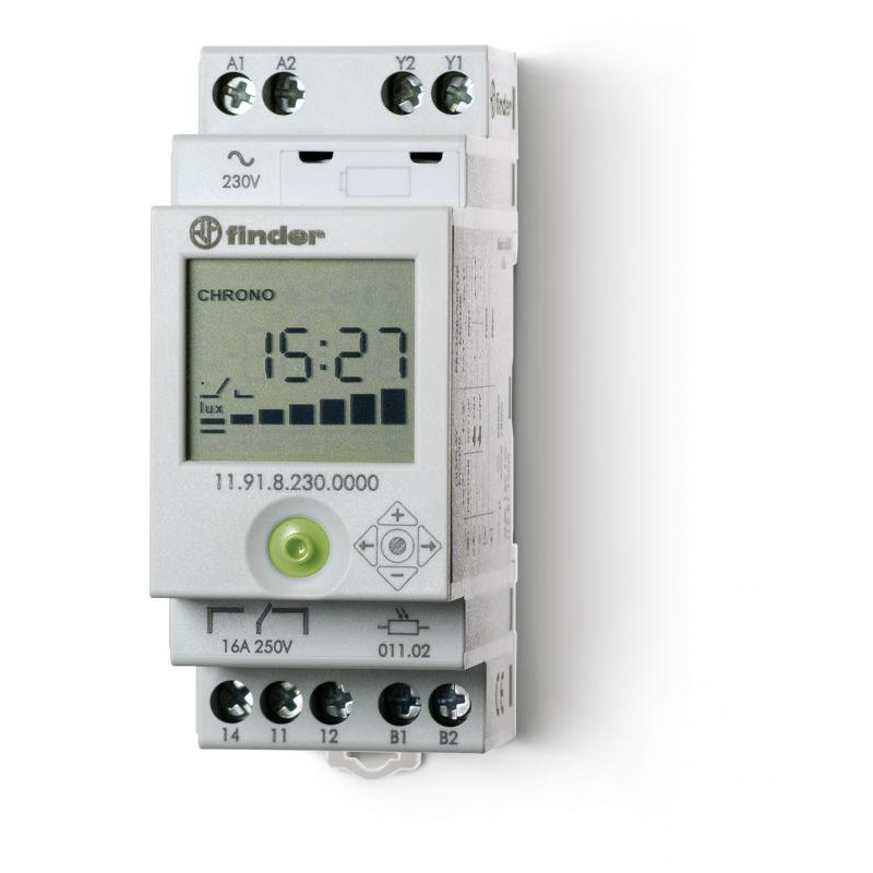 Description: Interrupteur crépusculaire avec horloge journalière intégrée pour coupure nocturne, 1 inverseur 16A 230V AC, avec 1 sortie auxiliaire
