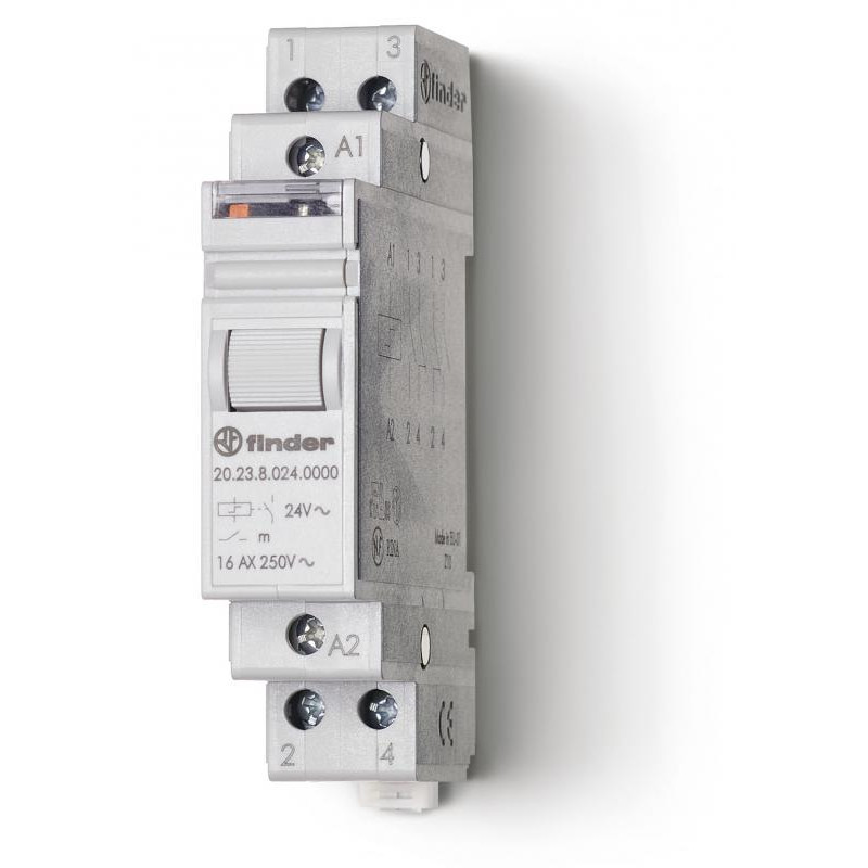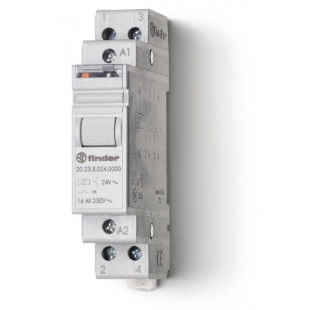 Marque: FINDERRéférence: 202380244000Description: Télérupteur modulaire interrupteur unipolaire 1NO + 1NC 16A 24V AC, bouton test et indicateur mécanique, matériau des contacts AgSnO2Emballage: 5