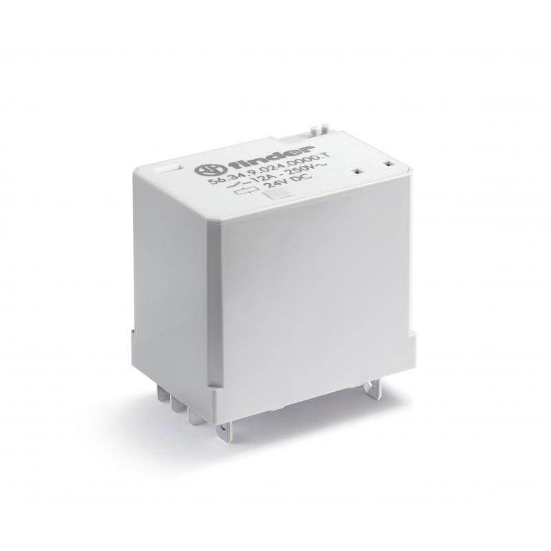 Marque: FINDER Référence: 563490240000T Description: Relais de puissance 4RT 12A 24V DC, pour application ferroviaire, matériau des contacts AgNi, embrochable sur support série 96 ou par cosse Faston 187 Emballage: 10