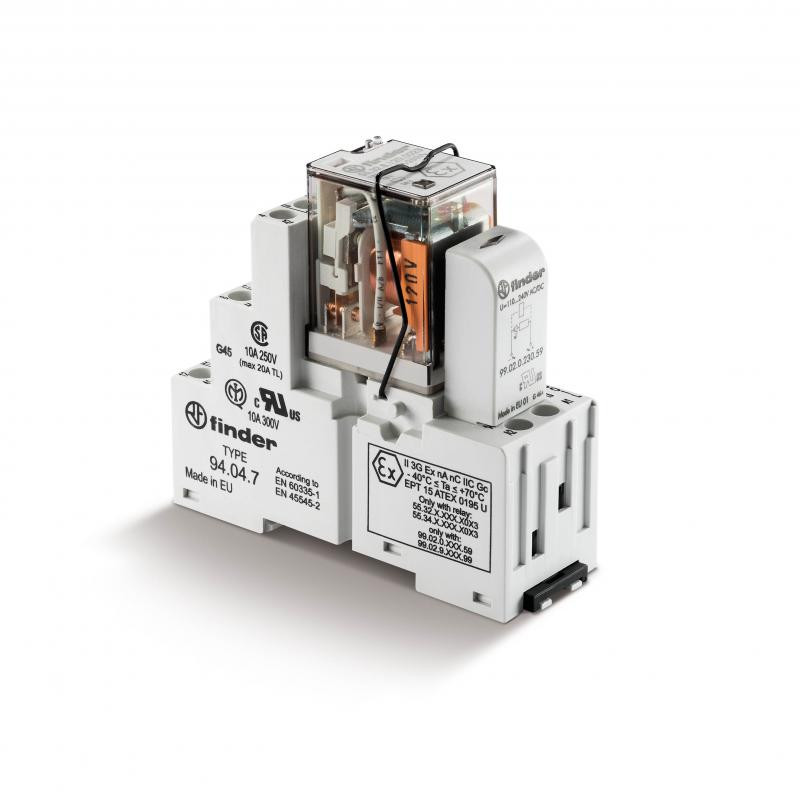 Description: Interface modulaire à relais 4RT 7A 110V AC, idéal pour l'interfaçage de sorties d'automate, étrier métallique, bornes à cage, module de présence tension et protection bobine, LED, ATEX