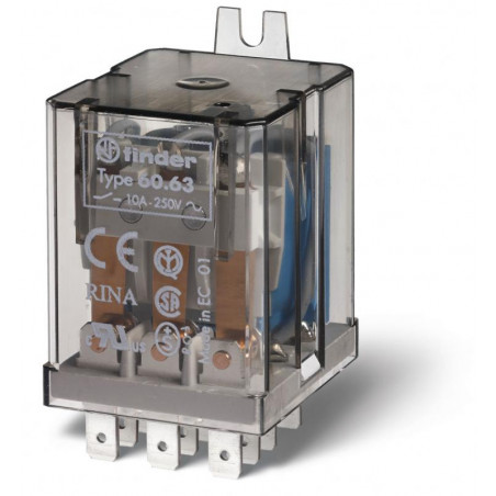 Marque: FINDER Référence: 606381100000 Description: Relais industriel 3RT 10A 110V AC, avec patte de fixation à l'arrière, raccordement par Faston 187, matériau des contacts AgNi Emballage: 10