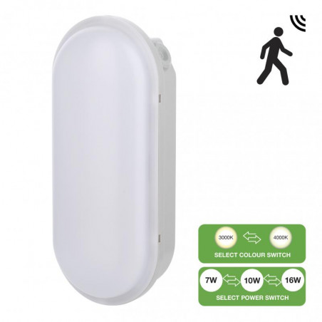 BAI Hublot LED Bulkhead Switch 2CCT avec capteur detecteur HF mouvement crepusculaire Ovale 7W-10W-16W 570-855-1500lm 3000K-4000K IP54 IK07 - Applique murale grise diffuseur blanc 225x100x65mm