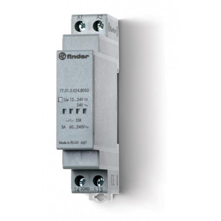 Description: Relais statique modulaire 1NO 5A 230V AC, tension nominale de sortie 230V AC, bornes à cage disposées sur les cotés opposés ""type relais"", commutation silencieuse sans arc ni rebond au zéro de tension, largeur 17,5mm
