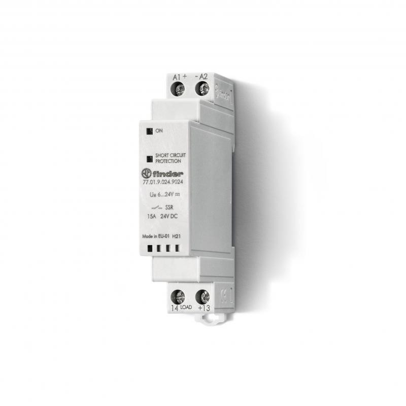 Description: Relais statique modulaire 1NO 15A 24V AC/DC, tension nominale de sortie 24V DC, bornes à cage disposées sur les cotés opposés ""type relais"", commutation sans arc ni rebond au zéro de tension, largeur 17,5mm