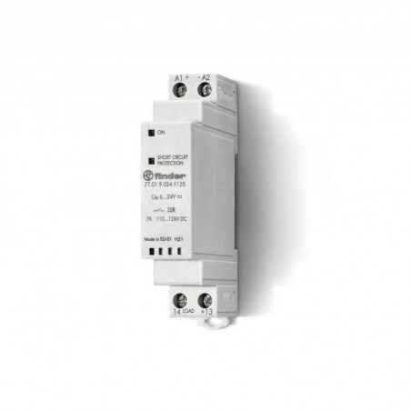 Description: Relais statique modulaire 1NO 7A 24V AC/DC, tension nominale de sortie 110 à 125V DC, bornes à cage disposées sur les cotés opposés ""type relais"", commutation sans arc ni rebond au zéro de tension, largeur 17,5mm