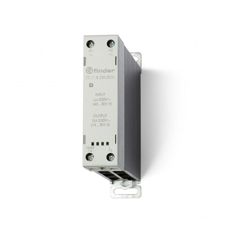 Description: Relais statique modulaire 1NO 15A 230V AC, tension nominale de sortie 230V AC, bornes à cage dispoées sur les cotés opposés ""type relais"", commutation instantanée silencieuse sans arc ni rebond, largeur 22,5mm