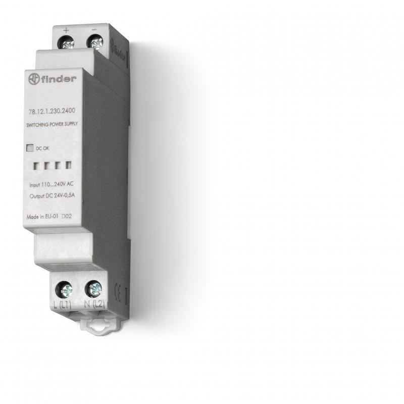 Description: Alimentation modulaire 0,63A, entrée : 110 à 240V AC, sortie : 24V DC 12W, protection thermique, de surtention et de court circuit, connexion en parralèle ou en série, bornes à cage