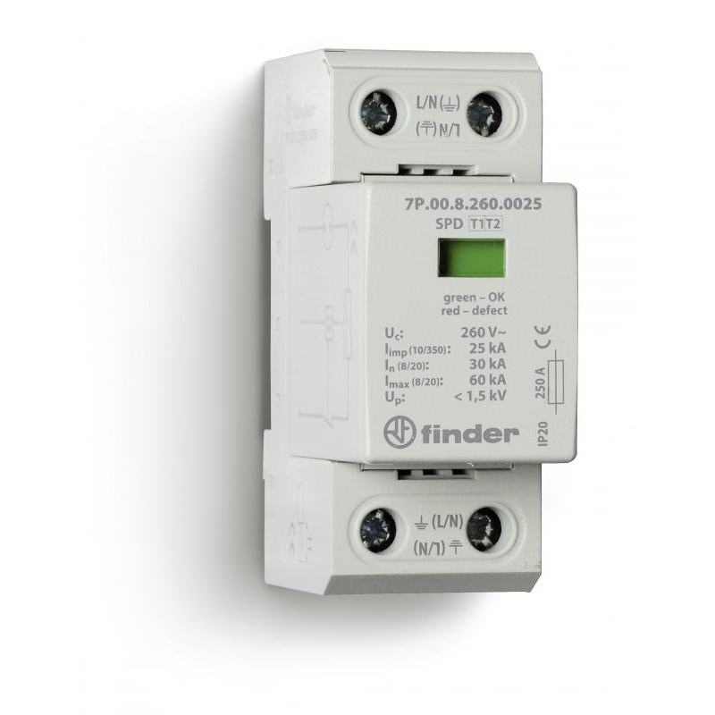 Description: Parafoudre T1+2 monophasé - combinaison varistor + éclateur Un=230VAC Uc=260VAC Iimp=25kA Up=1,5kV, modules interchangeables contrôle visiuel de l'état du varistor + Télésignalisation