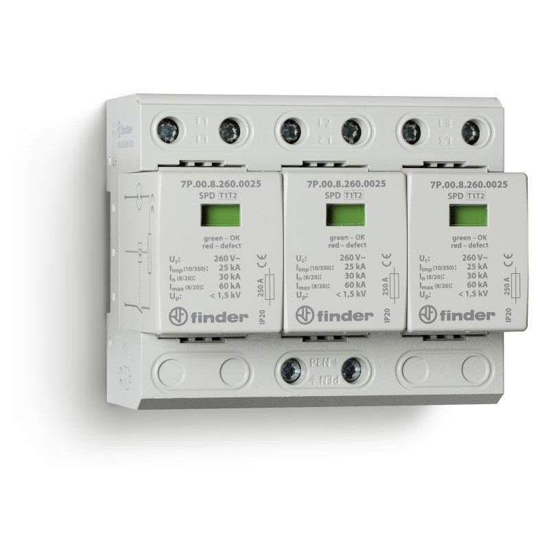 Description: Parafoudre T1+2 triphasé - L/PEN combinaison 3 varistors + éclateur Un=230VAC Uc=260VAC Iimp=25kA Up=1,5kV, modules interchangeables contrôle visiuel de l'état du varistor + Télésignalisation