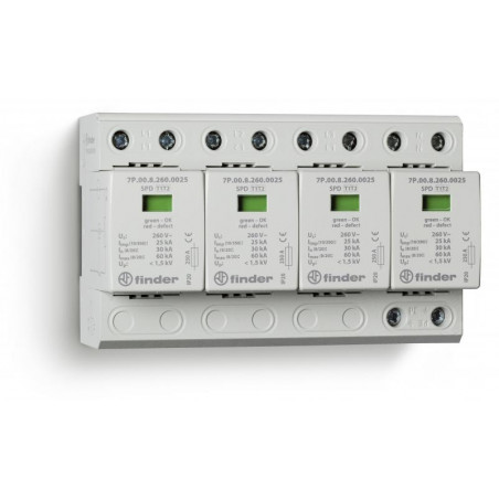 Description: Parafoudre T1+2 triphasé - L, N/PE combinaison 4 varistors + éclateur Un=230VAC Uc=260VAC Iimp=25kA Up=1,5kV, modules interchangeables contrôle visiuel de l'état du varistor + Télésignalisation