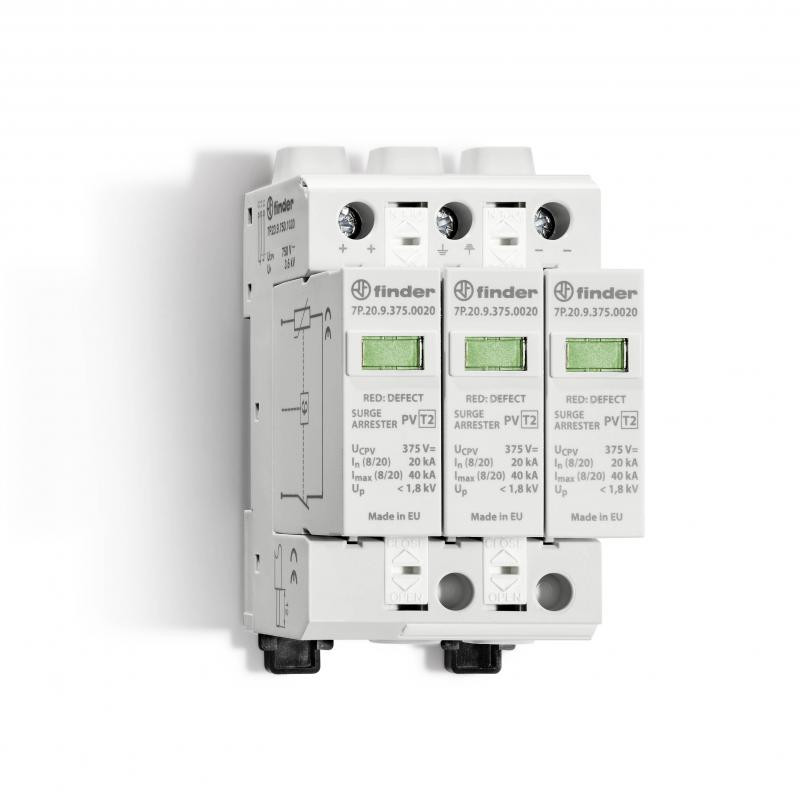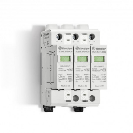 Marque: FINDERRéférence: 7P2397500020Description: Parafoudre type 2 photovoltaique 750VDC 3 varistors extractibles 20KA MAX 40KA 1,2KV control visuel état varistorsans TelesignalisationEmballage: 1