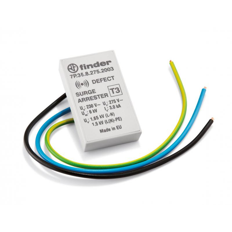 Marque: FINDER Référence: 7P3682752003 Description: Parafoudre type 3 inCorPoration Prise muralE varistor+ éclateur enY 275VAC 3KA Up P-N=1,65KV Up P(N)-PE=1,5KV indicateur acouSTique de L'état DU varistor Emballage: 1