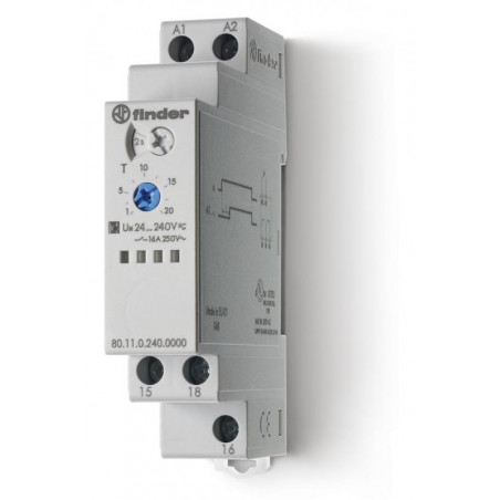 Marque: FINDER Référence: 801102400000T Description: Relais temporisé modulaire monofonction (AI) multitension 1RT 16A 12 à 240V AC/DC, bornes à cage, 6 plages de temps de 0,1s à 24h, pour application ferroviaire Emballage: 5