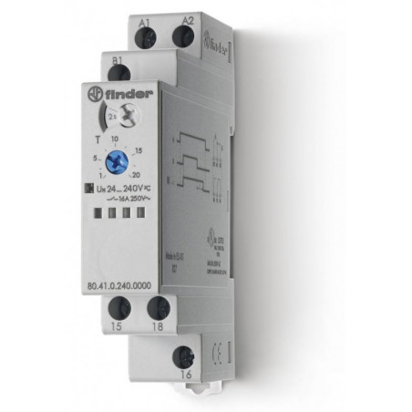 Marque: FINDER Référence: 804102400000 Description: Relais temporisé modulaire monofonction (BE) multitension 1RT 16A 12 à 240V AC/DC, bornes à cage, 6 plages de temps de 0,1s à 24h Emballage: 5