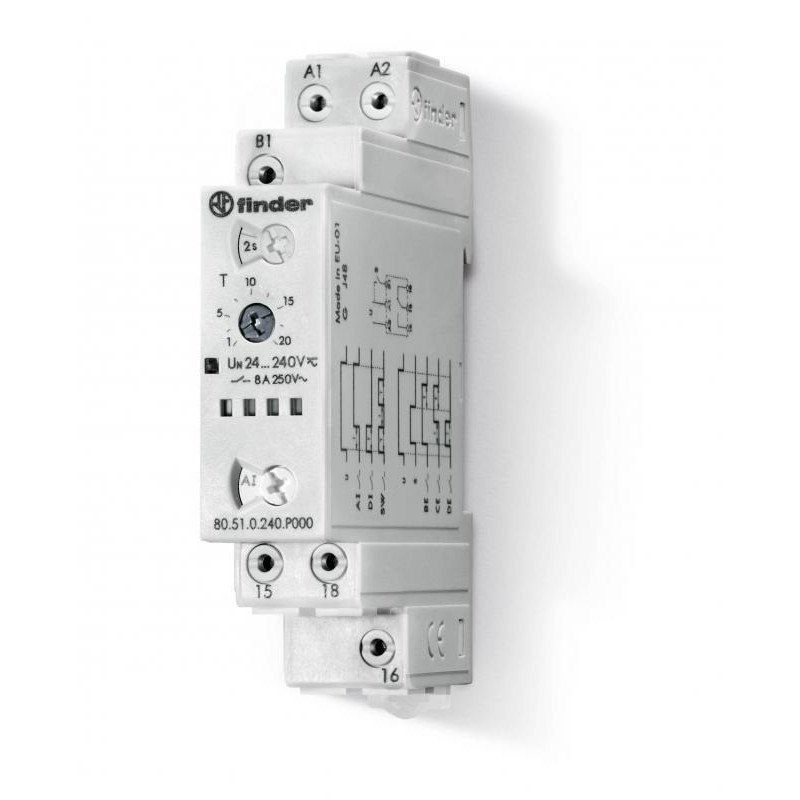 Description: Relais temporisé modulaire multifonction multitension 1RT 16A 24 à 240V AC/DC, 6 plages de temps de 0,1s à 24h, raccordement Push-in