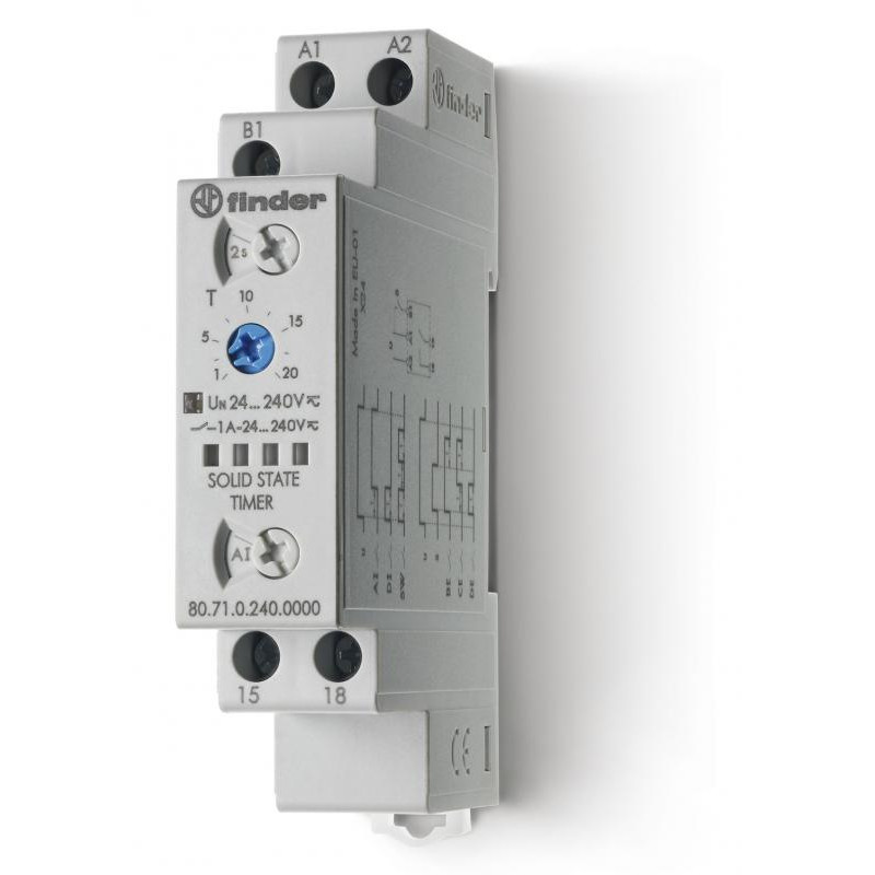 Description: Relais temporisé statique modulaire multifonction multitension 1NO 1A 12 à 240V AC/DC, bornes à cage, 6 plages de temps de 0,1s à 24h
