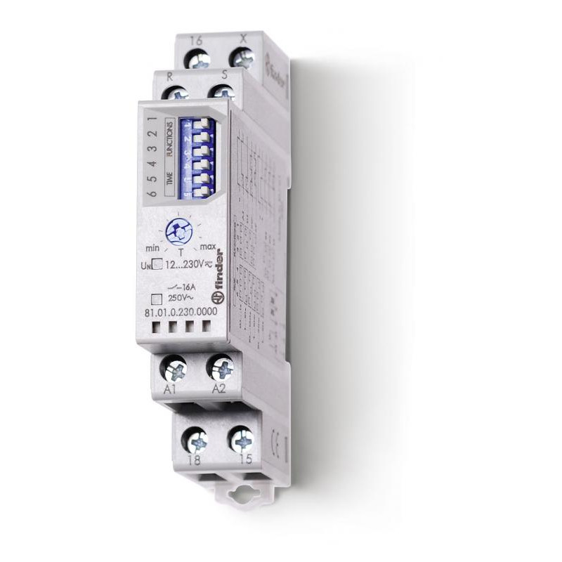 Marque: FINDER Référence: 810102300000PAS Description: Relais temporisé modulaire multifonctIon multitension 1RT 16A 12 à 230V AC/DC, avec fonction reset, borne à cages, plage de temps de 0,1s à 10h Emballage: 1