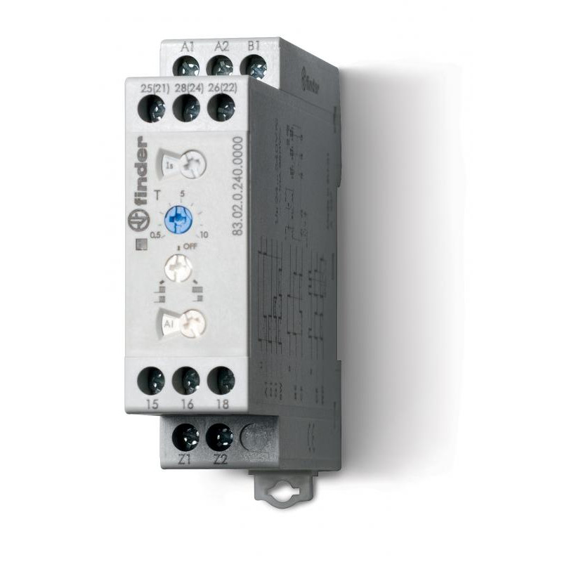 Description: Relais temporisé modulaire multifonction multitension 2RT 12A 24 à 240V AC/DC, 8 plages de temps de 0,05s à 10 jours, largeur 22,5mm
